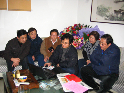 圖:火炬手代表們和汪雪艷的家人圍在電腦前觀看她在海地的照片