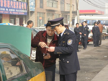 而在一周之前,安成鋪地區(qū)的客運市場還并非如此。針對不少出租車司機舉報反映的安成鋪地區(qū)多“黑車”經(jīng)營問題,淮南市運管處稽查人員經(jīng)過周密部署,先派稽查人員身著便裝在安成鋪使用照相、攝像、錄音等設(shè)備進行現(xiàn)場取證。1月22日上午,稽查人員在明察暗訪時,接到一位出租車司機現(xiàn)場舉報,稱一輛車牌號為皖D278XX的黑色帕薩特轎車正在攬客;槿藛T迅速尋找目標并將車輛停放在嫌疑車附近,用兩臺攝像機記錄下了其攬客及四名乘客上車的全部過程。時機成熟之后,稽查人員又用對講機通知已待命的執(zhí)法車輛及人員,迅速將該車圍堵查獲。