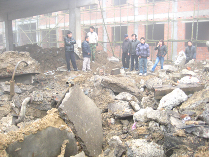 現(xiàn)場:油味彌漫水泥地炸成坑