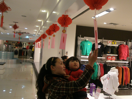 記者在龍湖南路某大型購(gòu)物商場(chǎng)內(nèi)看到,商家將一個(gè)個(gè)燈籠掛在走道上,并墜上燈謎供市民選猜,答對(duì)的市民還可領(lǐng)取一份紀(jì)念品!爸x絕參觀(打一字)”、“舉杯邀明月(下半句是什么)”、“東施(打一字)”百余條難易各異的燈謎既讓市民體會(huì)到元宵節(jié)的樂(lè)趣,同時(shí)也為商家吸引了不少顧客。