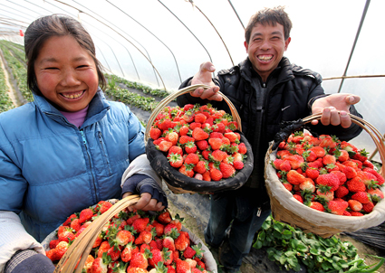 圖一:瞧,咱種植的草莓大又甜。 圖二:農(nóng)戶在采摘草莓運(yùn)往各地。 圖三:鱗次櫛比的草莓大棚。