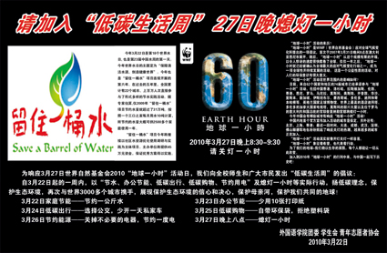 自哥本哈根會議上傳出的“環(huán)保鐘聲”猶在耳畔回響,轉眼間第18個世界水日已經(jīng)到來。2010年3月22日不僅是第18個世界水日,也是“留住一桶水”項目連續(xù)開展6周年的紀念日。為響應2010年上海世博會“讓城市更美好”的主題,安徽理工大學外國語學院的大學生環(huán)保志愿者,于3月22日向廣大市民發(fā)出參加“低碳生活周”的邀請:自3月22日起一周內(nèi)(該周的3月27日還是世界自然基金會2010“地球一小時”全球性公益活動日),以“家庭節(jié)水、辦公節(jié)能、低碳出行、低碳購物、節(jié)約用電”和地球一小時”等實際行動,弘揚低碳理念,保護生態(tài)環(huán)境,再次與世界攜手,展現(xiàn)保護生態(tài)環(huán)境的信心和決心,保護我們共同的地球!