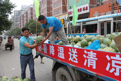 7月13日,鳳臺縣總工會開展送清涼活動,為市容、交警和供電等部門的一線職工,送去西瓜、礦泉水、毛巾、肥皂、白糖等防暑降溫品,體現了縣委、縣政府的關懷和溫暖。圖為市容系統(tǒng)的職工在搬運西瓜。
