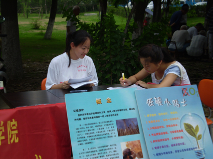 “您知道怎樣回收舊電池嗎?”“您家中是否有節(jié)能燈?”“您熟悉低碳環(huán)保的概念嗎?”。7月16日下午,安徽師范大學音樂學院的8名大二學生來到龍湖公園,她們利用暑假時間,開展宣傳環(huán);顒。