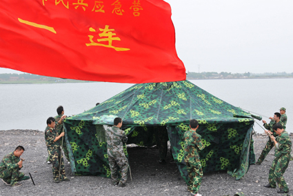 圖為應急連民兵正在進行一線防汛指揮部搭建演練。