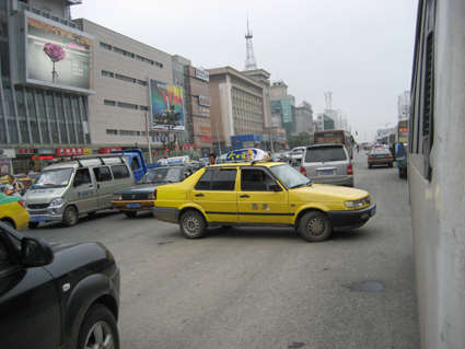 圖為這輛出租車不顧車流人流,就地亂調(diào)頭,導(dǎo)致過(guò)往車輛受阻。