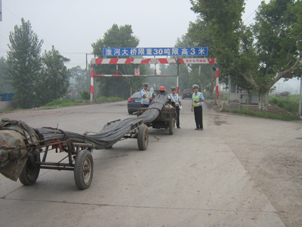 9月19日上午,淮南交警支隊田家庵二大隊的民警執(zhí)勤時在淮河大橋橋南發(fā)現(xiàn)一輛自制加長“運貨車”。此車的車頭就是一輛破舊的三輪車,為了拉鋼筋,在鋼筋的中部和尾部各加了一個輪軸,便制成了一個加長“運貨車”上路了。