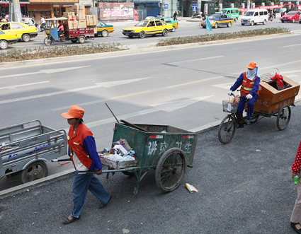 圖一為建設(shè)者們?cè)诤匣窗隹瓦\(yùn)專線工地加緊施工。 圖二為城市美容師在辛勤工作。 圖三為電力工人加班加點(diǎn)。