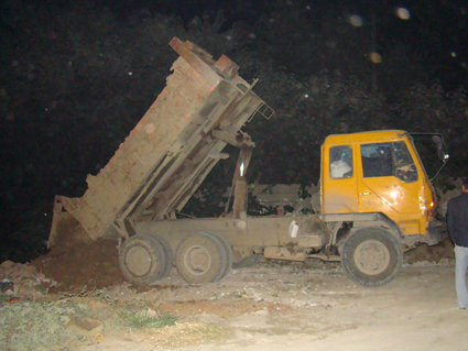 圖為一貨車正在往大堤上偷倒建筑垃圾。