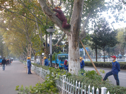 11月2日,記者在洞山中路上看到,園林局相關(guān)工作人員拿著電鋸正在對樹木枝葉進(jìn)行修剪。工人師傅們有的站在梯子上,有的借助梯子登上樹干,在電鋸的“嗡嗡”聲中,那些旁逸斜出的枯枝、病蟲枝紛紛墜落于地。地面上的工人及時地將落地枝條投入到運(yùn)載貨車內(nèi),環(huán)衛(wèi)工人也緊隨其后,將路面清掃得干干凈凈。一切進(jìn)行得是那么井然有序,而在他們工作過的地方,我們看到經(jīng)過修飾后穿戴整潔的樹木,就像哨兵般昂然聳立著。