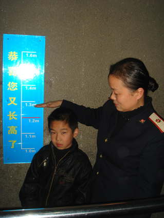 據(jù)了解,2009年以前,火車兒童半價票身高為1.1米-1.4米,2009年年初,鐵道部進(jìn)行了調(diào)整,把半價票上限調(diào)整為兒童身高不超過1.5米。而今年從12月1日起,兒童半價票身高標(biāo)準(zhǔn)比過去又長了10厘米,現(xiàn)在是身高1.2米-1.5米的兒童可購買半價票。得到此通知后,淮南火車站立刻對原來在售票處、候車室、檢票口及出站口設(shè)立的老標(biāo)牌進(jìn)行修改,以保證兒童順利乘坐火車。