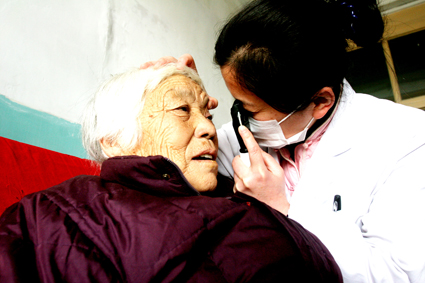 圖為醫(yī)護(hù)人員正在為敬老院里的老人檢查眼睛。