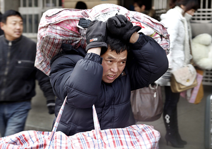。痹拢保谷,一名民工手提肩扛著行囊走出淮南火車站。當(dāng)日,為期40天的2011年春運正式啟動。據(jù)了解,淮南火車站春運首日,客流平穩(wěn),秩序井然。鐵路部門做好各項準(zhǔn)備工作并制訂相關(guān)應(yīng)急預(yù)案,全員上崗保證旅客安全出行。