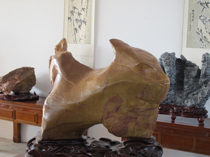 玉兔應(yīng)嫌天宮冷,偷抱玉杵到人間。唐先生十分喜愛(ài)這只“玉兔”,畢竟這是他親手“撿漏”而得。談到收藏奇石的愛(ài)好,唐先生顯得興致勃勃,他說(shuō),玩石必須擁有一雙慧眼,找準(zhǔn)觀賞的角度,細(xì)細(xì)揣摩、仔細(xì)品味,發(fā)現(xiàn)別人看不見(jiàn)的美。在他收藏的奇石中,姿態(tài)生動(dòng)者不乏其數(shù),有的像金蟾,有的像恐龍,有的像吃桑葉的蠶寶寶,還有的像奧運(yùn)火炬……6年前,唐先生在朋友的帶動(dòng)下開(kāi)始玩賞奇石,每次出差到外地,他一定會(huì)買些石頭帶回家。幾年間,他從全國(guó)各地帶回了好幾百噸石頭。唐先生說(shuō),玩石是一種極具文化氣質(zhì)的業(yè)余愛(ài)好,欣賞大自然的鬼斧神工,在覓石、賞石、以石會(huì)友的過(guò)程中,陶冶了心情,愉悅了身心。