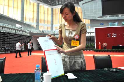 5月18日下午3點(diǎn),合肥經(jīng)濟(jì)圈城市黨政領(lǐng)導(dǎo)第二次會(huì)商會(huì)議峰會(huì)在淮南體育中心比賽館召開。下午1點(diǎn)剛過,志愿者許荻就來到了會(huì)議地點(diǎn),她是一位會(huì)務(wù)組的志愿者,負(fù)責(zé)參會(huì)代表準(zhǔn)備會(huì)議材料。在現(xiàn)場,她對(duì)一些材料再做最后的整理檢查,看有沒有什么遺漏。許荻告訴記者,當(dāng)天早上,會(huì)務(wù)組的志愿者們就已經(jīng)把材料準(zhǔn)備好,10點(diǎn)左右的時(shí)候,他們來到了會(huì)場,把材料進(jìn)行裝袋,擺放。中午吃完午飯之后,略作休息,他們?cè)俣葋淼浆F(xiàn)場,進(jìn)行最后的檢查整理工作。為了確保萬無一失,每一個(gè)步驟都很細(xì)致。許荻告訴記者,雖然她原來也參加過一些志愿者活動(dòng),但是這次意義顯得更為重大。他們的形象也關(guān)乎淮南的形象。聯(lián)絡(luò)組的志愿者李婷婷來自大通區(qū)團(tuán)委,她負(fù)責(zé)對(duì)口接待桐城代表團(tuán)。她與許荻有相同的感受。李婷婷曾經(jīng)是2010年豆腐文化節(jié)的志愿者,對(duì)志愿者工作很有經(jīng)驗(yàn)。李婷婷認(rèn)為,自己能夠以一個(gè)志愿者身份參加進(jìn)來,感覺很榮幸!為來淮貴賓做好服務(wù)是理所應(yīng)當(dāng)?shù)模?/FONT>