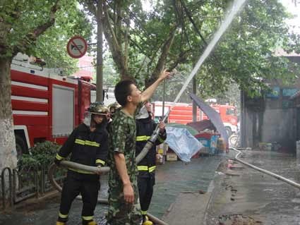 記者在現(xiàn)場看到七八輛消防車在不停地向樓頂噴水,但火勢依然兇猛,不時能看見明火不斷地躥上房頂,大火沿2號樓的東頭向西頭蔓延,4戶樓頂?shù)木用窦抑卸既计鹆舜蠡。為了控制火勢,消防官兵兵分三路,一路從樓的正面用高壓水炮向樓頂噴水,一路?號樓的東頭向失火房間注水,另外一路爬上樓頂將房頂破碎以阻斷火勢的蔓延。經過一個多小時的奮力撲救,火勢基本上得到控制。