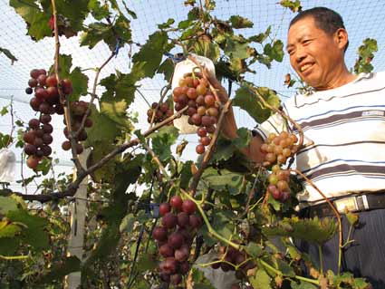 不僅有袋有網(wǎng),旁邊的葡萄園里還有大棚,原來,這為的是讓早熟葡萄趕早上市,嘗鮮的葡萄價格自然高,收入也可觀。從1994年開始,劉郢村就開始種葡萄,由于起步早,長期的種植經(jīng)驗讓這里的果農(nóng)樂于采用新技術(shù)培育葡萄,以期有更大的經(jīng)濟(jì)效益,更能滿足市民的口福。