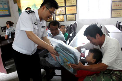 圖:愛(ài)心人士向一名留守兒童贈(zèng)送一個(gè)可愛(ài)的新書(shū)包。