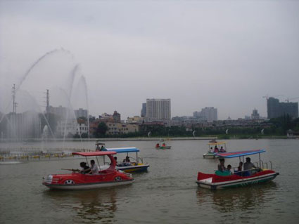 圖為近日走俏的龍湖泛舟熱鬧場面。