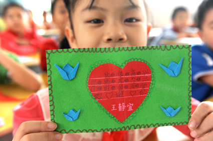 圖二:9月3日,同學(xué)們送給她的愛心賀卡寫滿祝福話語。