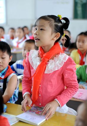 9月3日,淮南師范附屬小學(xué)二(7)班教室內(nèi),身患白血病康復(fù)后重返校園的女生陳藝菲在課堂上發(fā)言。