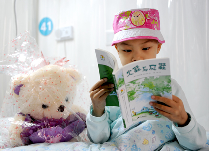 圖三: (資料圖片)2011年3月5日,病床上陳藝菲閱讀同學(xué)們送來的課外書籍。
