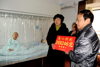 圖四:(資料圖片)2011年3月5日,淮南師范附屬小學(xué)副校長趙平(左二)將師生、家長愛心捐款送到身患白血病陳藝菲的爸爸陳春峰(右)手中。