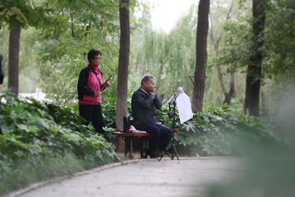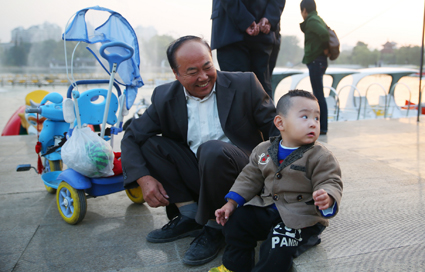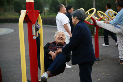 圖一:用口琴,笛子來一曲《紅塵》,剛剛退休2年的曹先生找到了屬于自己的新生活。 圖二:練習(xí)功夫扇的老人們英姿颯爽。 圖三:老太太身體硬朗笑開懷。 圖四:帶孫子快樂多。