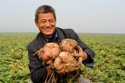 圖二:毛集實(shí)驗(yàn)區(qū)焦崗湖鎮(zhèn)孫臺村村民孫兆芝開心展示豐收的出口訂單山芋。
