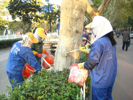 據(jù)了解,樹木刷白是冬季樹木養(yǎng)護(hù)管理的一項(xiàng)重點(diǎn)工作,給行道樹粉刷石灰水,可以殺死寄生在樹干上的一些越冬真菌、細(xì)菌和害蟲,土壤里的害蟲也不會輕易“入侵”樹體,同時(shí)粉刷的石灰水能夠反射陽光,從而使樹干在白天和夜間的溫差減小,不易造成樹木裂開。