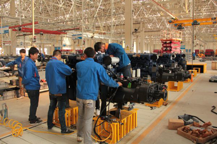 圖二:陜汽淮南專用汽車有限公司寬敞明亮的裝配車間內(nèi),工人正在裝配發(fā)動機。