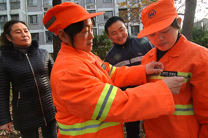 為深入貫徹黨的十八大精神,建設(shè)美好淮南,市城管行政執(zhí)法局為全市3088名環(huán)衛(wèi)工人統(tǒng)一制作了工號牌,掛牌上崗。今后環(huán)衛(wèi)工人在上崗作業(yè)時,統(tǒng)一佩戴標有單位、姓名、編號的黑色工號牌,塑造文明規(guī)范的環(huán)衛(wèi)行業(yè)服務(wù)形象,接受社會監(jiān)督。圖為12月4日下午,田家庵區(qū)環(huán)衛(wèi)工人身穿佩戴著統(tǒng)一標志的工作服。