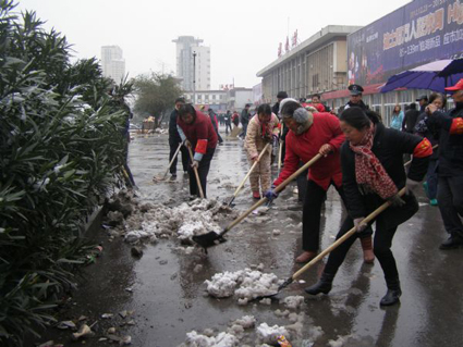 圖:30多名城管志愿者和城管執(zhí)法隊(duì)員來到火車站廣場鏟除積雪。