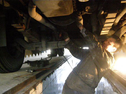圖為淮南中北巴士公司三車(chē)隊(duì)技術(shù)人員鉆入車(chē)底檢修公交車(chē)底盤(pán)。