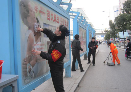 圖:擦洗公交站牌,為市民營造干凈的市容環(huán)境