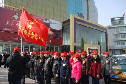 當(dāng)日上午9時,淮南市運管處門前,30名出租車駕駛員莊嚴(yán)宣誓,“向雷鋒學(xué)習(xí),踐行雷鋒精神”。本著自愿報名的原則,經(jīng)過層層嚴(yán)格篩選,這30名平時表現(xiàn)優(yōu)異的出租車駕駛員從全市3000多名出租車駕駛員中脫穎而出,成為淮南市出租車?yán)卒h車隊的首批成員。他們的出租車引擎蓋上貼著醒目的紅色雷鋒頭像標(biāo)志,雷鋒車隊的代表接過了寫有“淮南市出租車?yán)卒h車隊”的鮮紅隊旗。