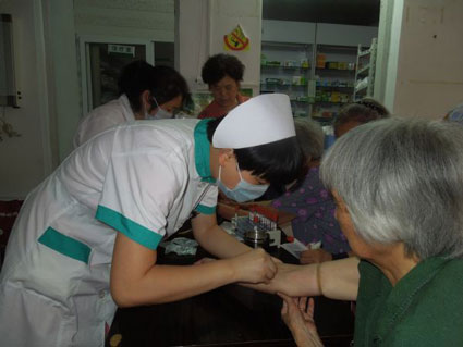 在基地社區(qū)衛(wèi)生服務站,醫(yī)務人員為老人測量血壓,檢查肝腎功能、血糖、血脂、血常規(guī)等進行多項檢查。龍泉街道華健醫(yī)院社區(qū)衛(wèi)生服務中心副主任沈群介紹,醫(yī)務人員不僅現(xiàn)場為老人做免費健康體檢,還為老人建立健康檔案,對慢性病患者進行3個月隨訪一次,對行動不便的老人將上門免費體檢。據(jù)了解,8月29日早上,在基地社區(qū)衛(wèi)生服務站還將舉行一次免費健康體檢,沒有來得及體檢的老年人可前往。