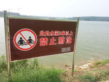 圖:泉山湖邊一處禁止游泳警示牌。