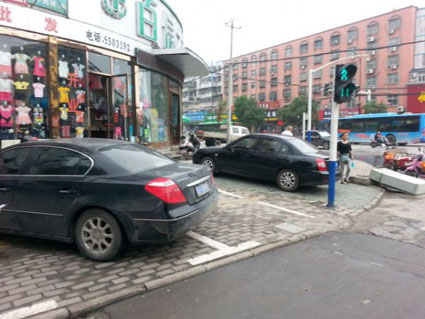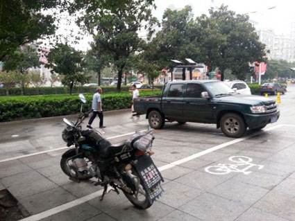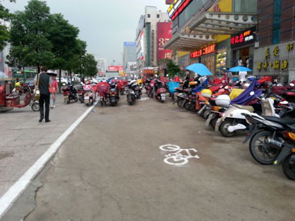 圖三:龍湖路新華書店前,機(jī)動車停在自行車位上。
