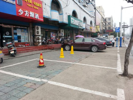 在龍湖路,車流高峰時(shí)段,停車位可謂一位難求。為方便市民停車,相關(guān)部門在綠化帶開出停車位,供市民免費(fèi)停放。記者看到,一處可允許停放兩輛車的地方,停放一輛車后,另一個(gè)停車位卻被放置了一個(gè)錐筒占據(jù)。記者看到,在一些單位前劃出的停車位被刻意圍住,有的放置“請勿泊車”的牌子。