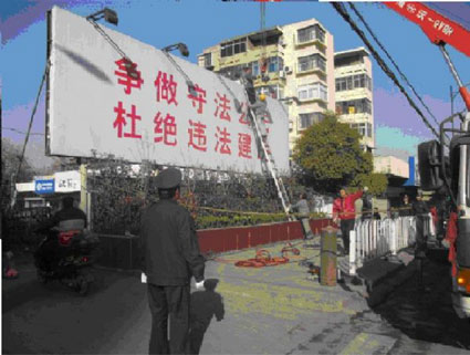 圖:泉山南路一處“高炮”廣告正在拆除中。(圖片由田區(qū)城管執(zhí)法局提供)