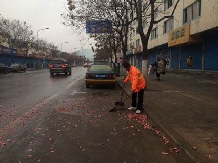 1月31日,農(nóng)歷大年初一,清晨的城市街道上沒有了以往的繁華和喧鬧,只傳來新年開門納福的鞭炮和煙花聲。然而早出的市民會(huì)發(fā)現(xiàn),每隔幾百米就會(huì)有一位身穿橘黃色工作服的環(huán)衛(wèi)工人,在街道上清掃燃放后留下的鞭炮殘?jiān)。凌?點(diǎn),環(huán)衛(wèi)工人黃鐵軍早早地就來到林場(chǎng)路自己負(fù)責(zé)的路段,當(dāng)記者趕到林場(chǎng)路時(shí)已經(jīng)是上午7點(diǎn),此時(shí)的林場(chǎng)路一片潔凈,大量的鞭炮碎屑已被清掃干凈,黃鐵軍和同事一起正在轉(zhuǎn)運(yùn)清掃出來的鞭炮碎屑和垃圾。這時(shí)一戶居民家門前響起了鞭炮的聲音,炮聲剛停,黃鐵軍馬上拿著掃帚默默地掃了起來!懊康竭^年鞭炮紙是最多的,要是不及時(shí)清掃,風(fēng)一吹鞭炮紙就會(huì)到處飛,那就更難掃。所以我們就采取哪里放炮就掃哪里,這樣就會(huì)減少對(duì)環(huán)境的污染!秉S鐵軍一邊掃地一邊告訴記者!懊磕甑拇竽瓿跻欢际亲蠲ψ罾鄣,除夕夜很多居民都會(huì)燃放鞭炮,辭舊迎新。所以道路上會(huì)有大量的鞭炮紙堆積,為了能夠及時(shí)清掃,我和同事們基本都是從凌晨4點(diǎn)多就開始工作,大概要清掃3到4個(gè)小時(shí)才能把除夕夜的鞭炮碎屑清掃干凈。但是春節(jié)期間燃放鞭炮的人多,為了環(huán)境的整潔,我們只能不停地清掃。”