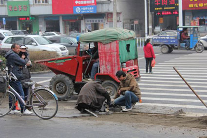 圖:施工人員正在給堵住斑馬線的綠化帶鋪設人行道磚