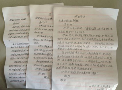 3月27日,山朱小學(xué)的一位老師帶著孩子們親手寫的感謝信來到報社,找到記者,想通過報紙向這群愛心人士表達孩子們最純真、最善良的感謝與祝福。老師對記者說,這群愛心人士在寒冷的冬天為孩子們送來新鞋子,讓這群孩子很感動,總想著要報答這些叔叔阿姨,因為孩子們的能力有限,老師商量著就讓孩子給這群叔叔阿姨寫封信吧,從一年級到六年級收到新鞋子的孩子都在學(xué)校工工整整地寫了信,表達了他們對叔叔阿姨的感激之情及收到禮物的喜悅之情。22個孩子22封信,雖然有的孩子年齡小,信的內(nèi)容不是很多,字也不是很漂亮,但他們的心是真誠的。后來,老師從中挑選了三封感謝信想寄給這群愛心人士,卻因為沒有地址無法寄出,一直被神圣地鎖在老師的抽屜里。