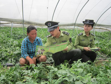 圖二:執(zhí)法人員走進(jìn)田間地頭將“西瓜地圖”送到瓜農(nóng)手中。