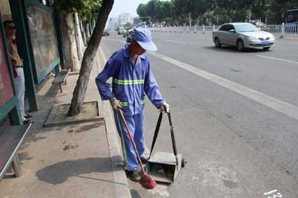 隨后,記者接過沈師傅遞來的掃帚,沿著道路兩邊認真地清掃起來。按照劃分,記者當天須清掃大約500米的距離,道路兩邊都要清掃,折合下來就是近1000米路段。剛開始,記者倍感輕松,隨著清掃距離的增加,慢慢的記者感覺手中的掃帚越來越沉,汗水也不住地流淌,沒一會,藍色工作服就被汗水浸透了。