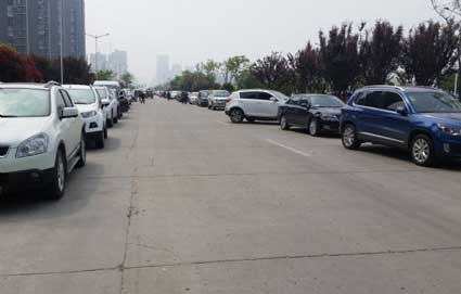 5月9日上午,記者經(jīng)過花鳥魚蟲市場看到,該市場是在道路西側(cè),從湖濱西路與廣場北路的十字路口一直往北延伸,很多市民每到周末都喜歡早早來到這里挑選最新鮮最好看的花草,記者來到此處時(shí)已是早上10時(shí)左右,該路段的路面被綠化帶分成兩條道路,一條由南向北,一條由北向南,而這兩條道路的兩側(cè)都停滿了車輛,應(yīng)該有4條機(jī)動車道的道路硬是被擠成了兩條機(jī)動車道,更有的車主因?yàn)檎也坏杰囄,干脆把車斜插在兩車之間,汽車前半部在綠化帶上,后半部則很突兀地停在機(jī)動車道上。