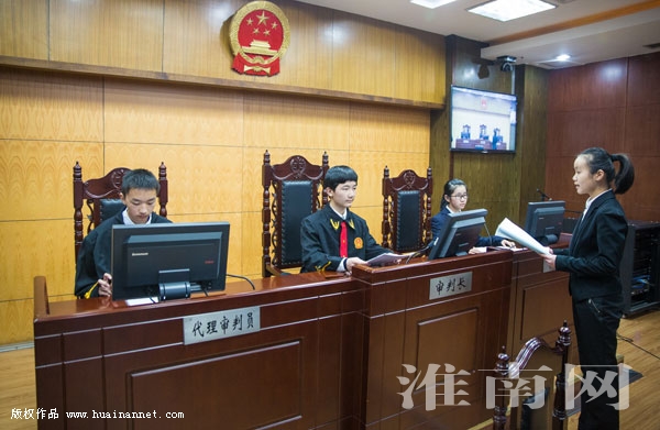 近日,淮南市中級人民法院聯(lián)合洞山中學(xué)一同開展了“模擬體驗少年法庭”活動。法官帶著師生代表參觀了立案大廳、訴訟服務(wù)大廳、智能化多功能審判法庭等地,用通俗易懂的語言,簡明扼要地講解審判法庭的組成人員以及整個法庭的格局布置、法庭審判的步驟和程序等,同時,學(xué)生們還走上審判臺,敲響法槌,當(dāng)起了“小法官”,親身體驗了法庭審判的神圣和莊嚴(yán),感受司法的公正和力量。圖為“開庭”現(xiàn)場。