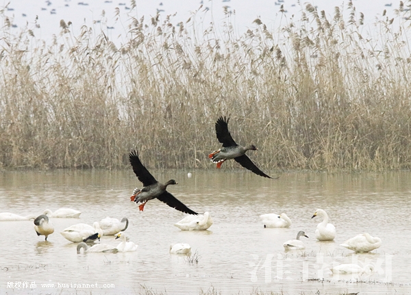 圖二:兩只豆雁(國家二級保護動物)在水面上飛翔。