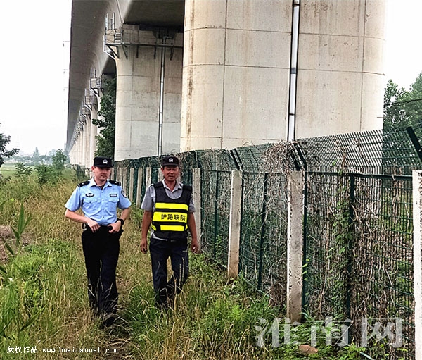 淮南東站派出所負(fù)責(zé)管轄合蚌高鐵47公里的線路安全,主要對合蚌高鐵8.679公里的低路基區(qū)段進(jìn)行往返巡查。每天,民警要對轄區(qū)內(nèi)的高鐵線路徒步巡邏兩次,同時(shí)對保安崗位、護(hù)欄網(wǎng)片進(jìn)行檢查。一路上,沒有陰涼可以躲避,兩人的衣服早已被汗水浸透。高溫下巡線,最大的挑戰(zhàn)是體力不支,容易中暑。鄭亮亮拿起隨身攜帶的礦泉水,一點(diǎn)一點(diǎn)喝,不敢喝多,時(shí)間在不知不覺中過去,轉(zhuǎn)眼已步行了兩個(gè)小時(shí),兩人的衣服都汗透了貼在身上。